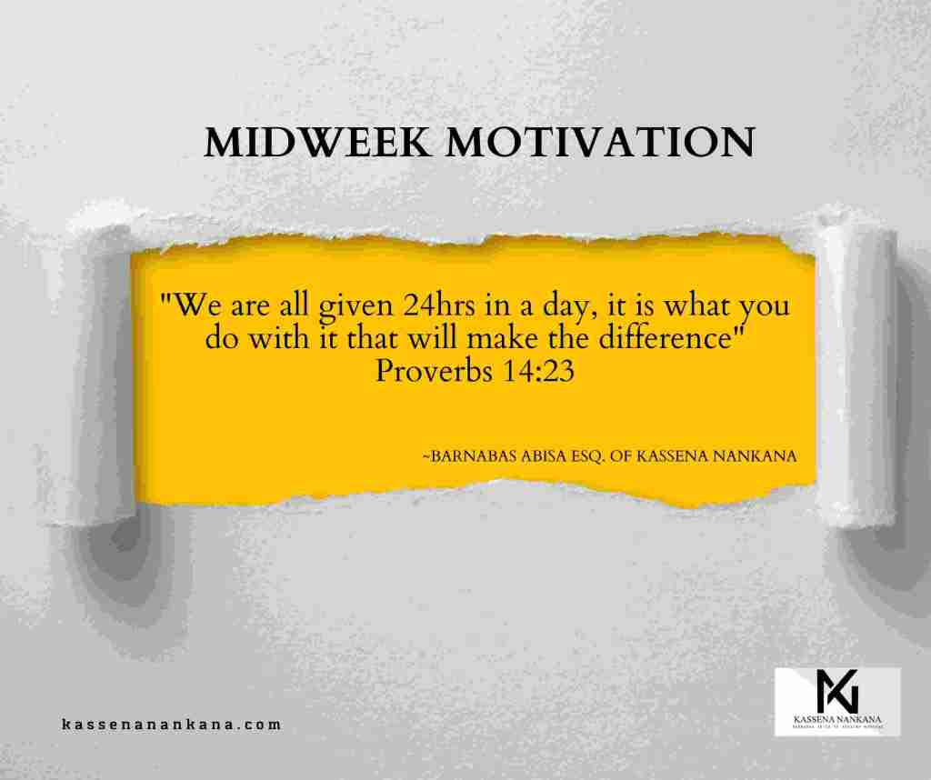 Society MIDWEEK MOTIVATION Posted by Barnabas Abisa on 14 Sep 202214 Sep 2022 Hard Work always pays off. “All hard work brings a profit, but mere talk leads only to poverty.” Proverbs 14:23 NIV Share this: Click to share on Facebook (Opens in new window) Facebook Click to share on X (Opens in new window) X Click to share on LinkedIn (Opens in new window) LinkedIn Click to share on Telegram (Opens in new window) Telegram Click to share on Pinterest (Opens in new window) Pinterest Click to share on WhatsApp (Opens in new window) WhatsApp Like Loading... Related